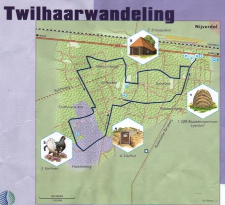 July 7 2007, Nijverdal, Route 24; Twilhaarwandeling, 7 km. After parking near the hotel/restaurant and ‘visitor’s center’ (Sallandse Heuvelrug) and peeking inside this impressive center you’ve got the message; this can be a very busy and crowded place… Luckily were there around dinnertime in marginal weather so we had a quit walk trough impressive terrain. Even spotted some deer! Easy trail, slight slopes, most sandy and not crossing any tarmac!