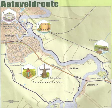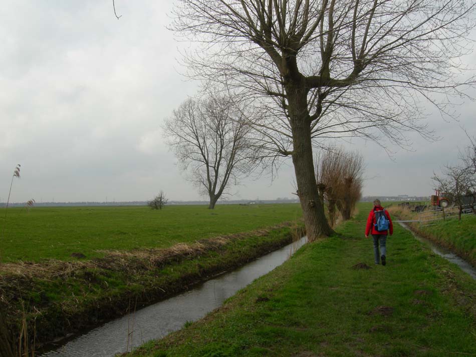 March 8, 2008, Aetsveldroute (Weesp), route 52, 12 km (not 10km). Although the view along this route is often great, a really disappointing hiking route. The first part of the trail (6km) you walk on a busy road along the river ‘Vecht’. Things improve somewhat after passing ‘Uitermeer’, but it’s still tarmac (2km) and a very limited view due to the many houseboats. Upon finally reaching the archaeological interesting ‘Aetsveldscheweg’ it’s great again, muddy trail right through the meadows… If you like city walks things improve even more when you reach Weesp, which has an interesting history… On the upside; if your really interested in history you’ll appreciate the ‘bastions’, ‘fortresses’ (‘Stelling van Amsterdam’) and ‘bunkers’ (WW2) along the route.