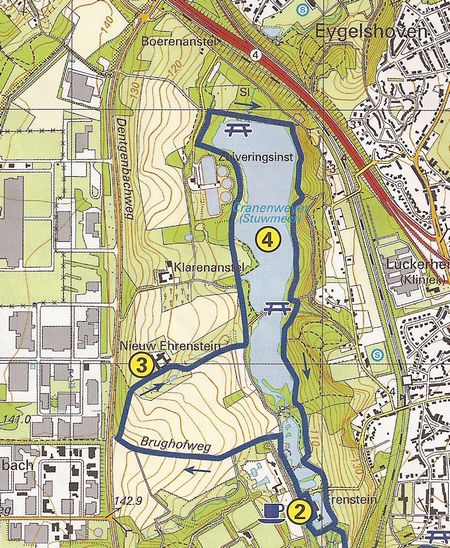 Some trails (mix of asphalt and mud) can be muddy and from a Dutch perspective there are even some ascents and descends. All in all an easy track; too bad about the noise of the busy highways nearby…We only circled the reservoir but you can extend the walk by entering the town of Kerkrade.