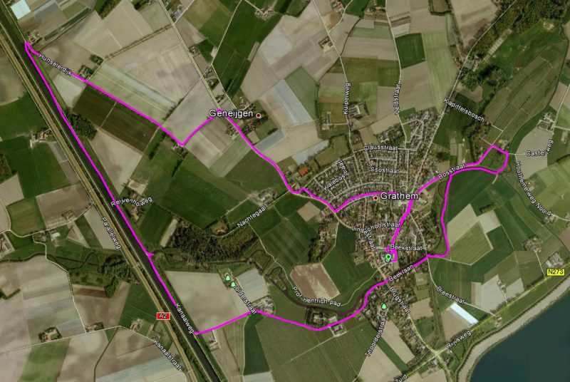 Monday 4 March 2013, based on the Kastelen- en Grathemerroute near Grathem in the province of Limburg; wandelrouteboek route 95, 9.1 kilometers. Easy walk, first part of the route refers to ‘castles’ and some – not too impressive – can be seen from some distance. An exception is the beautifully restored castle Groot Bruggenum but in summertime this might be invisible as well due to surrounding trees…The trip takes you along the straight canal Wessem – Nederweert where the noise of the busy highway A2 is very present… All in all not very impressive although halfway you encounter a special earthwork where the Uffelse beek is led under (!) the canal to cross it…When you passed the Grathemer Molen (Mill) in the village, with its iron (!) wheel, you can follow the signs for the ‘Puinebrök ommetje’ a reinstated local walk… Note the outdoor artwork you pass along the walk, just before returning to Grathem.