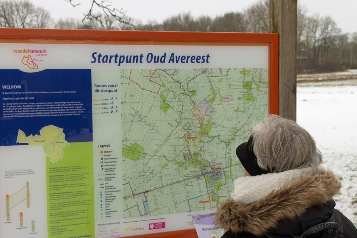 Sunday, 25 January 2015, nature trail “de Reest” in the Province of Overijssel, near Balkbrug, Wandelroute boek nr. 18; approximately 6 kilometers. Explored on a dull winter-day, bit of drizzle and pretty slippery because of melting snow even with our excellent footwear… Don’t let the dull pictures mislead you; we will definitely return to this area as it is very varied and must be beautifull with some sunshine. The hike leads you over ancient path used in the old days (back to 1750) where church visitors and laborers trotted to their destination. Now excellently signposted and sometimes crossing some farmyards. The starting point in Aoud Avereeest provides ample parking space and the visitor center “De Wheem” offers maps and other goodies as well as some beverages…